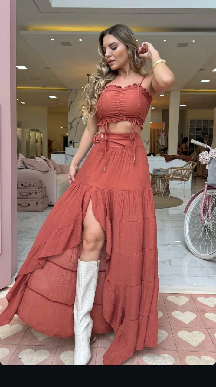 A saia longa, com uma fenda estratégica, destaca suas curvas com charme, enquanto a fivela dourada adiciona um toque de sofisticação. O cropped complementa o look, garantindo conforto e estilo.